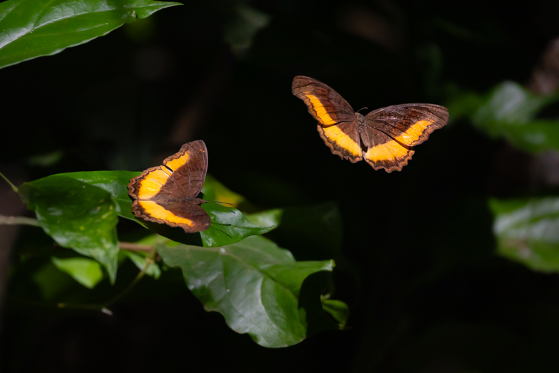 Een Koningpagesoort dronk van een plasje water op een grindpad en vloog daarbij regelmatig op. Het is een kwestie van de lange adem en heel veel beelden maken en een dosis geluk. Bij sterke contrasten, zoals het geval bij deze Koningspage, lukte het met de autofocus, geholpen door de animal-eyefocus, redelijk om de vlinder en de kop een aantal keren scherp in het beeld te vangen. Bij de 2e tegen de donkere (groene)achtergrond lukte dit ook goed. Het 3e en 4e beeld zijn gemaakt tijdens een vlinderbalts. Het vrouwtje zat en bleef zitten op een plek en het mannetje kwam regelmatig naar haar toe. Het was hier ook veel beelden maken, met het vrouwtje in de focus én bij het mannetje in het zicht de ontspanknop vol ingedrukt voor salvo’s van beelden. Vlinderfotografie en specifiek vlinders in vlucht is een uitdagende maar zeer leuke bezigheid. Foto 3 twee ‘golden-banded pipers’.