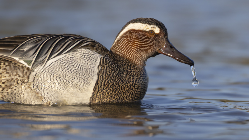Een stuk schaarser dan de Wintertaling is de Zomertaling. Iets groter (38 ipv 36cm) en wat minder kleurrijk maar net zo fraai. Beide behoren tot de kleinste eenden van Europa. Het mannetje met zijn kenmerkende brede witte oogstreep en lichtblauwe rugveren is voor velen een zeer geliefde vogel om te spotten en een persoonlijke favoriet :).