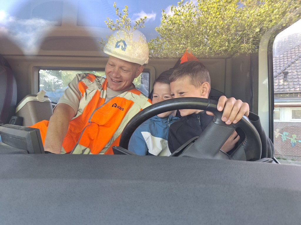 Tijdens de les leerden de kinderen wat KWS allemaal doet – van wegenbouw tot het aanleggen van riolering en dijken – en daarna mochten ze zelf de cabine van de vrachtwagen in. Daar zagen ze met eigen ogen hoe beperkt het zicht is voor de chauffeur, vooral in de zogeheten dode hoek: het gevaarlijke gebied naast en achter de vrachtwagen waar je als fietser of voetganger onzichtbaar kunt zijn voor de chauffeur.