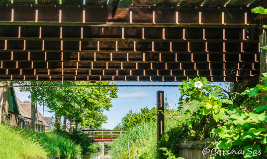 Daarna kom je aan in Opperdoes, je vaart onder vele bruggetjes door die de huizen met de dorpsstraat verbinden. De laatste foto is een foto waar we onder een van die bruggetjes gaan: het licht van de zon speelt met de spleten tussen planken van de brug.