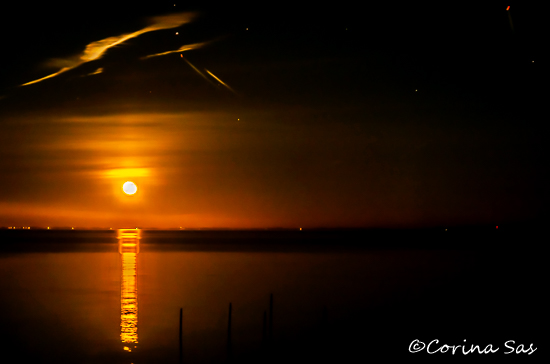 Dit is een van de eerste foto’s die ik toen heb gemaakt, de maan staat nog laag en heeft een lange spiegeling op het water, tegelijkertijd verlicht de maan de vliegtuigstrepen die er boven hangen en een aantal stokken van de visnetten. Zij staan als een mooi decor aan de rechterkant van de spiegeling net nog in het licht van de maan. Eigenlijk geeft de maan geen licht, maar weerkaatst het licht van de zon. De zon is het enige object in ons zonnestelsel dat, in grote mate, zelf licht produceert.