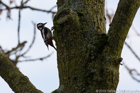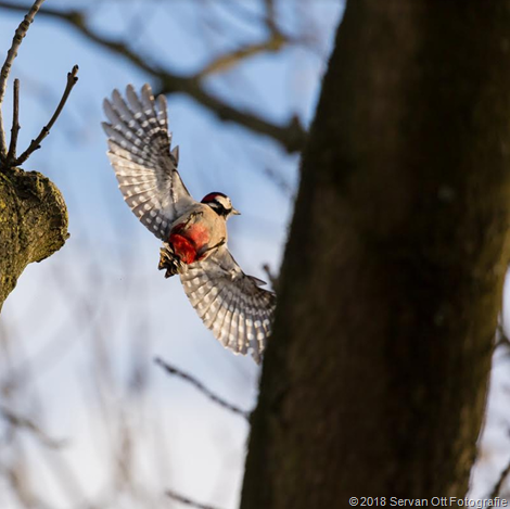 Bont gekleurd, altijd prachtig om de grote bont te bonte specht (23-26cm) te zien in zijn zwart, wit, rood. Als specht altijd oplopend tegen bomen, daarbij is een specifieke gebouwde staart van groot belang. Twee zeer stevige veren als pilaren dienen als een belangrijke steun en geven hem controle en evenwicht tegen de stam.