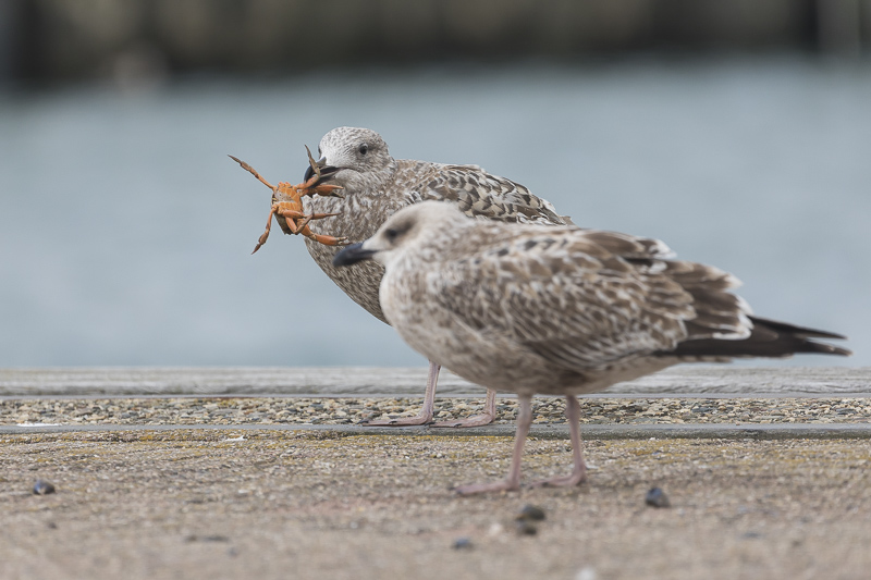 Geliefd voedsel voor meeuwen zijn schaaldieren vooral voor zilver,- en mantelmeeuwen aan de kust of op en rondom de eilanden is dat gewild voedsel. Jonge zilvermeeuwen pikken op Texel een krabbetje mee.