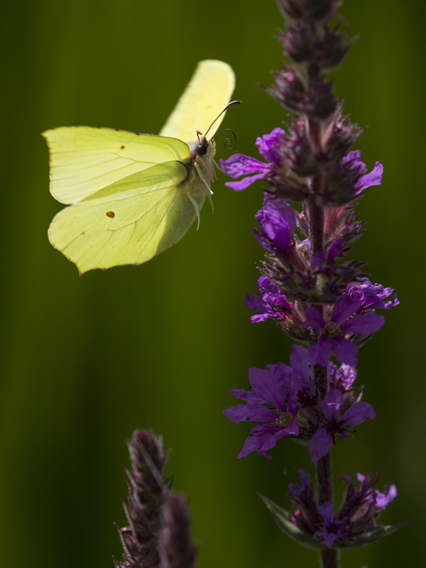 Altijd een erg mooie vlinder om te zien, de citroenvlinder. Vrij schaars in Noord-Holland tot algemeen in het Oosten en Zuiden. De Kattenstaart die nu uitbundig bloeit langs de waterkanten is een magneet voor vlinders en ook voor de Citroenvlinder.