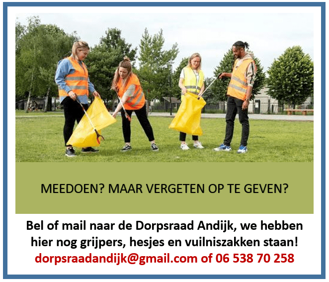 Mail, WhatsApp of bel naar de dorpsraad met opgaven van je naam, adresgegevens en je telefoonnummer, en hoe laat je de grijpers, hesjes en vuilniszakken komt ophalen en terugbrengen!