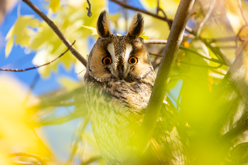 De herfst is de tijd dat de Ransuilen op hun mooist te fotograferen zijn. Bij elkaar komend alla ‘roestend’ in een boom. Tot het laatste blad is gevallen, ze geen beschutting meer hebben en veelal weer vertrekken. Foto’s van Ransuilen in een gekleurde Suikeresdoorn (Acer saccharum) bij Utrecht. Voedsel zoeken ze tijdens de nachten en vliegen ze met zijn allen tijdens de donkere schemer weg, om voor zonsopkomst weer naar hun favo-boom terug te keren. Schitterende vogels met hun grote oranje ogen en grote oorpluimen; die geen functie hebben als oorschelpen, maar over de status (volwassen, sterk, gezond) en over hun stemming vertellen.