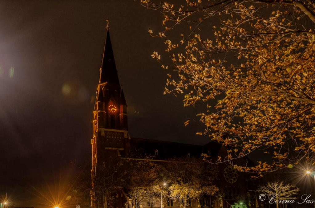 Ik rij de Dorpsstraat in richting de kerk en ineens zie ik het: zo wil ik het op de foto!Het licht van de schijnwerpers langs de toren, de straatverlichting als sterretjes rondom de kerk.Bij de nabewerking van de foto is er zelfs lensflare zichtbaar, precies richting de kerkklok.Ik denk aan Kerst en Oud en Nieuw!