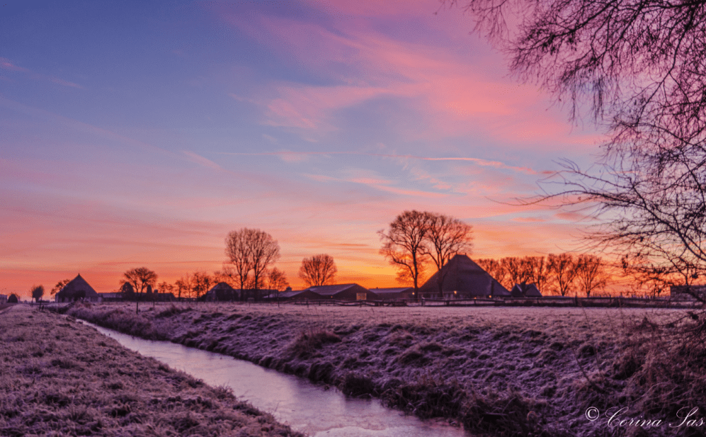 In het verhaal van vorige week had ik geschreven: wat zal de volgende dag brengen? En wat denk je? die dag had het gevroren, het was licht bewolkt en er was een mogelijkheid om de zonsopkomst te zien. Dus ik naar dat mooie stukje polder, Andijk Oost. Dat stukje polder heeft nog een vleugje nostalgie zoals je dat op Texel ziet, vind ik. Boerderijen, hekken, slootjes en een landschap zonder windturbines in de verte. Tenminste als je richting de Oosterdijk kijkt. Ik reed de Rikkert op: Nostalgie ten voeten uit! Een paar boerderijen, een slootje en hoge bomen vormden silhouetten door het licht van de opkomende zon. Dat licht zorgde niet alleen voor een mooi silhouet, ze maakten ook mooie kleuren, door de hoge luchtvochtigheid, in de lucht. Het plaatje maakte de winter op dat moment compleet door de rijp op het grasland en het ijs in het slootje. Toen verder de Rikkert op. Nog een paar plaatjes van schapen, boerenlandhekken en de oranje gekleurde lucht gemaakt. Toen draaide ik me om en zag nog een spektakel in de lucht. Een mooi lijnenspel van kleuren gemaakt door de zonnestralen van de zon wat ik jullie nu ook wil laten zien. Er is een tijdsverschil van ongeveer 10 minuten tussen het maken van deze twee foto’s, je ziet dat het licht en de kleuren veranderen. Ook omdat de zon omhoog klimt waardoor de zonnestralen veranderen van afstand tot het wolkendek. Maar ook, ben ik van standpunt veranderd. Tegen de zon of met de zon in de rug maakt het verschil. Maar ook die paar stappen. Zie het resultaat.