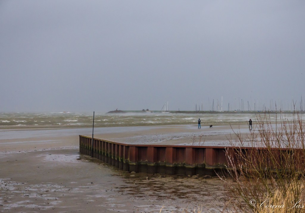 Vrijdag 18 februari: storm Eunice raast over ons land. En dat hebben we geweten. Kon het niet laten om even achter dijk te gaan kijken. Rond 15.00 uur parkeer ik de auto onder aan de dijk om verder te lopen naar het strandje van Andijk. Met de wind in de rug loop ik de dijk op. Zou ik het wel doen? Moet ook weer terug…