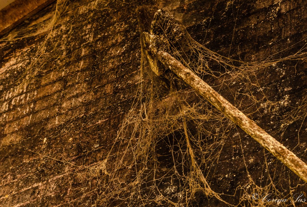 Schoonmaken was er al een lange tijd niet gedaan, maar zeker wel bedacht met goede bedoelingen. Tegen de muur leunde de ragebol op een roestige pen die uit de muur stak. De ragebol ooit eens met goede bedoelingen gekocht en gebruikt. Op de foto versleten en behangen met het spinrag die eigenlijk met de ragebol weggehaald moest worden.