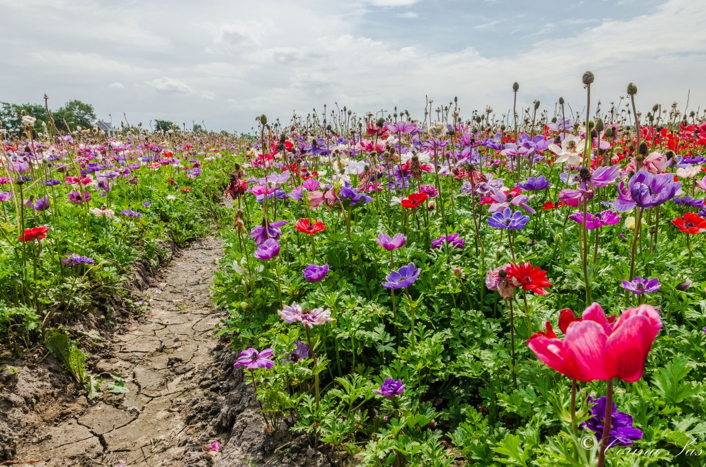 Een veld bloeiende anemonen kom je niet zo vaak tegen op de akkers in West-Friesland. Toch worden ze wel hier geteeld. Er zijn wel 120 soorten anemonen. Een anemoon is een echte bijen en vlinderplant en je koopt ze als kleine knolletjes of als plant. Je kunt ze van januari tot december planten. Ze bloeien, afhankelijk van het soort, van april tot oktober. De anemonen op de foto zijn de zomerbloeiers en zijn vast en zeker geplant voor de knolletjes net als de tulpen en hyacinten voor hun bollen. Mijn buurman had eind jaren zestig ook een hoekje anemonen op zijn landje staan. Hij teelde ze voor de knolletjes. Die knolletjes zien eruit als truffels. Als klein meisje kwam ik daar wel over de vloer om te spelen met de buurtkinderen. Ik zie hem nog staan in zijn boetje, die achter zijn huis stond: 2 gaasbakken op de pellerstafel. De ene bak met gerooide anemonenknolletjes, in de andere bak de gepelde knolletjes. Hij pelde ze altijd zelf, het was schijnbaar een secuur klusje. In ieder geval was het voor ons zeer interessant! We keken geboeid naar zijn grote handen, waar de klei nog onder zijn nagels en in groeven van de handplooien zat. Die handen die een voor een knolletje ter hand nam en deze pelde, tot meerder knolletjes. Wat een werk!