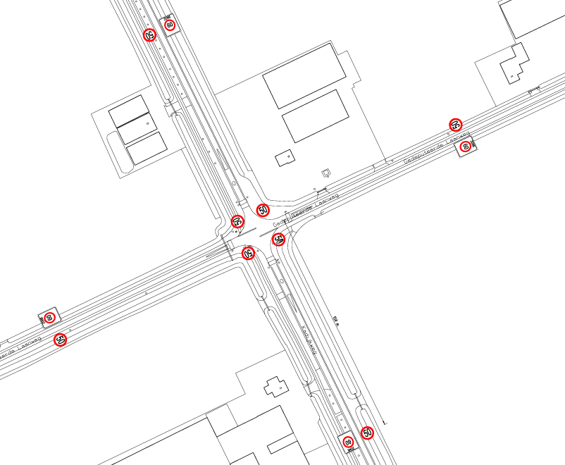 Schematische voorstelling van een rotonde op het kruispunt Ged. Laanweg – Kadijkweg