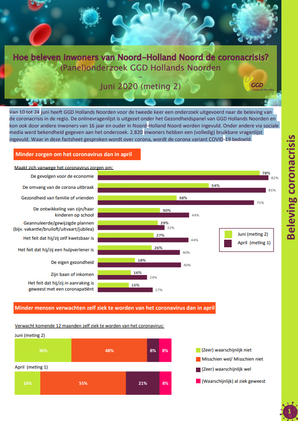 Van 10 tot 24 juni heeft GGD Hollands Noorden voor de tweede keer een onderzoek uitgevoerd naar de beleving van de coronacrisis in de regio. De online vragenlijst is uitgezet onder het Gezondheidspanel van GGD Hollands Noorden en kon ook door andere inwoners van 16 jaar en ouder in Noord-Holland Noord worden ingevuld. Onder andere via sociale media werd bekendheid gegeven aan het onderzoek. 2.820 inwoners hebben een (volledig) bruikbare vragenlijst ingevuld.