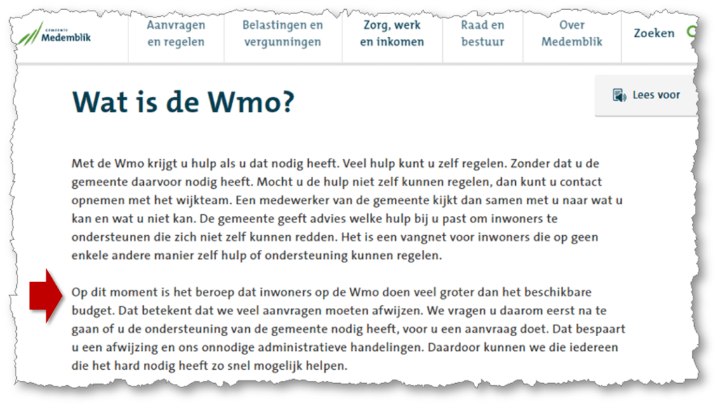 Het betreft de eerste twee zinnen van de tweede alinea. PW 2010 vindt het niet juist dat in de eerste zin wordt gesteld dat het beroep op de WMO veel groter is dan het beschikbare budget. Vervolgens wordt in de tweede zin gesteld dat het gevolg hiervan is dat veel aanvragen worden afgewezen. Een kwestie van oorzaak, zin 1 en gevolg zin 2. PW 2010 vindt het niet juist van de gemeente Medemblik, dat het budget onvoldoende is en dat dat
