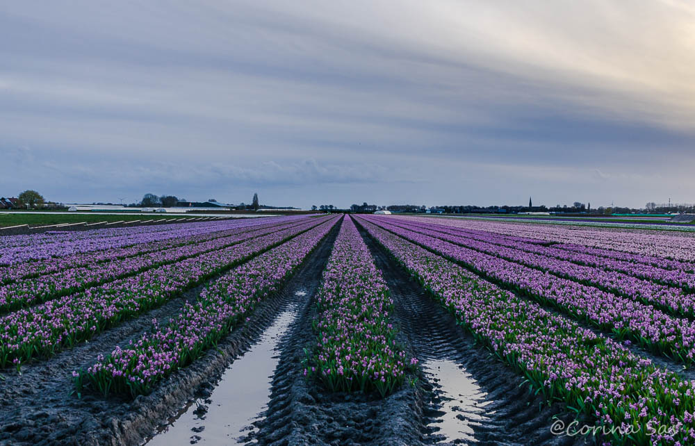 In de polder ligt een mooi hyacintenveld, daar wilde ik een foto van maken. Toen ik daar stond zag ik vanuit het zuidwesten, dat de lucht boven de polder donker begon te kleuren. Het begin van de buien die, volgens de weersvoorspellingen, over ons land zouden gaan trekken. Op hetzelfde moment probeerde de zon met haar zonnestralen, die in het het noordwesten nog aan de hemel hing, de aarde nog wat te verwarmen.