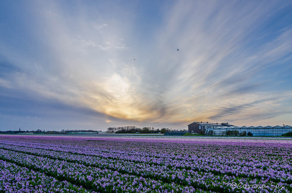 De windveren die daar waren ontstaan, waren ook een voorbode van weersverandering. De zon leek wel een strijdt te voeren met die windveren en die donkere lucht. Wie zal er winnen? Op het moment dat de zon achter de donkere wolken verdween leek het wel of er een explosie in de lucht plaats vond. En de naderende donkere lucht, vanuit het zuidwesten? Die kleurde bijna net zo mooi blauw/paars als de hyacinten op het land.