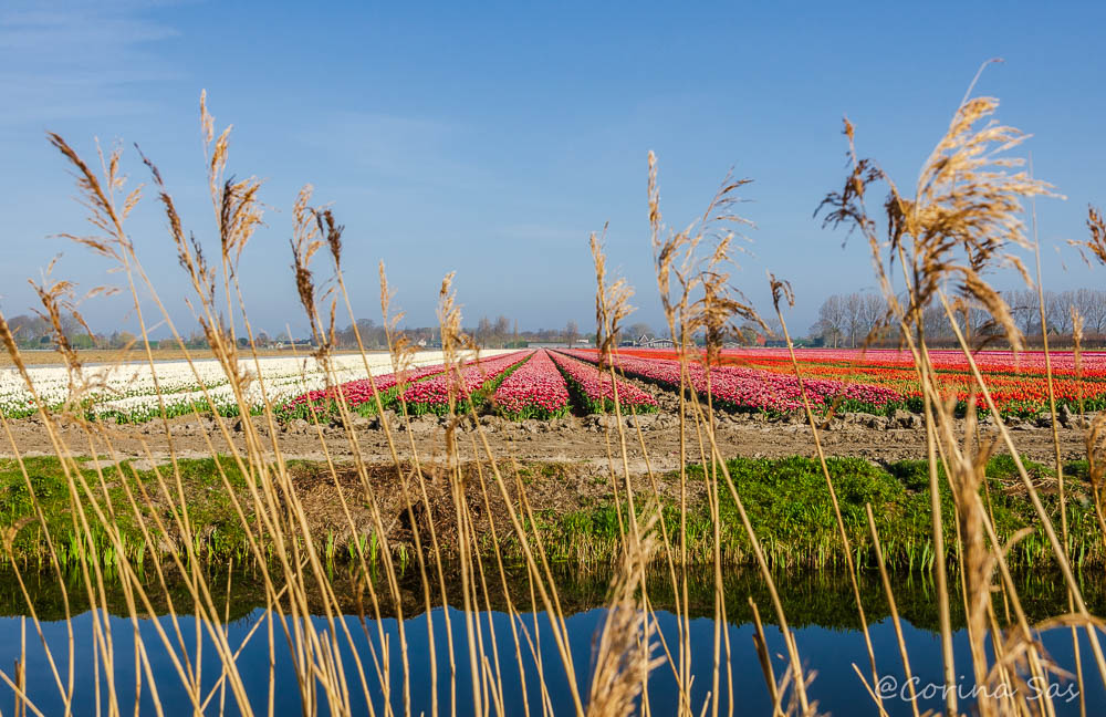 Tulpen, in het voorjaar zorgen ze ervoor dat de polder er kleurig uitziet. Ze worden geplant in het najaar, om in het voorjaar in lange rijen in bloei te staan. Maar soms zijn de tulpenkwekers net architecten. Dan worden de tulpenbollen niet in mooie rechte lijnen geplant, maar gaan ze mee met de vormen van het land. Het land wat gescheiden wordt door een sloot of een rijweg. In plaats van rechte lijnen van tulpen zie je mooie gekleurde golven op het land staan, de golven die meegaan met de landgrens langs het water. ieder stukje grond wordt zo goed benut. En toch netjes in lange rijen naast elkaar in gekleurde blokken, soort bij soort.