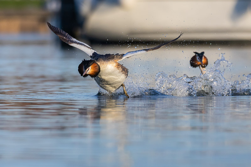 Volop baltstijd nog bij de Futen, één van de meest spectaculaire rituelen is die van het admiraalzeilen en de cathouding. 1 van de twee start in een balts plots met weg te rennen over het water wat eindigt met een muur van water en gespetter én de vogel zijn/haar vleugels breed opzet; de cathouding én het ‘rennen en het met brede vleugels landen’ het admiraal zeilen. Als een uitnodiging om vervolgens weer beide bij elkaar te komen voor een vervolg van de balts. Een schitterend gezicht en beleving, in de komende weken nog zeker de kans om dit bijzondere ritueel waar te nemen. Gemaakt in de haven van Enkhuizen en ieder voorjaar één of twee workshops speciaal in het thema van de futenbalts.