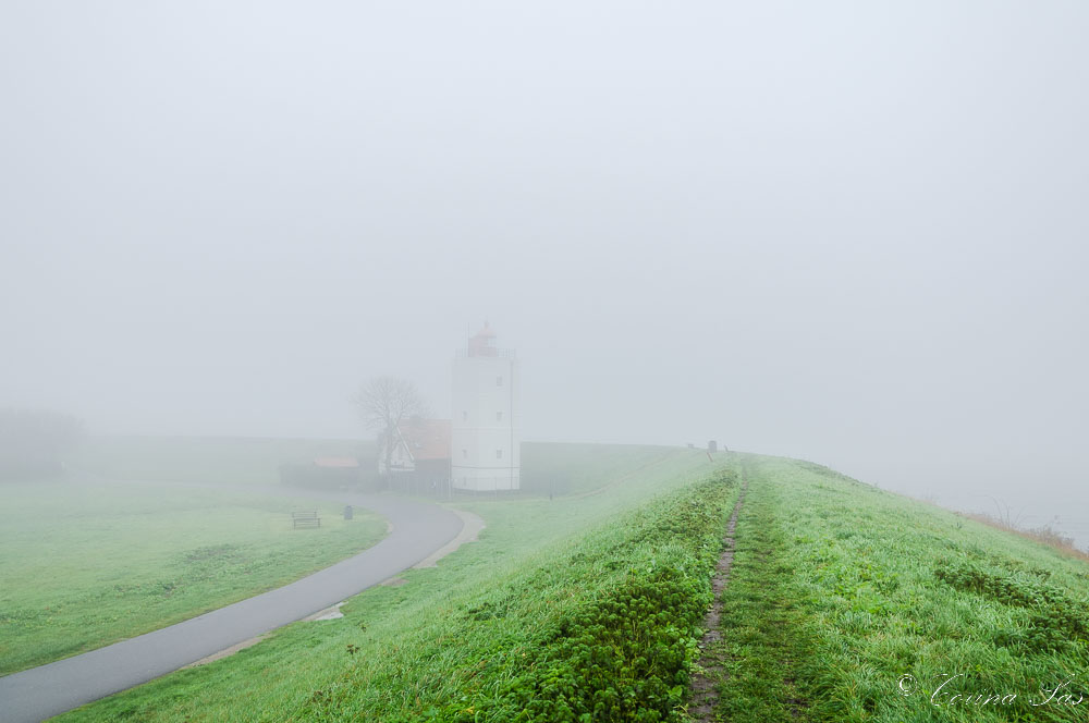 Hier staat ie dan, de vuurtoren ‘De Ven” aan de Oosterdijk, midden in de mist. De vuurtoren die werd gebouwd in 1700. En diende als lichtbaken voor schepen, zodat men wist dat men op de goede weg was. Destijds om de route van de Waddenzee naar Amsterdam te markeren. Dat hoeft niet meer, men heeft daar allang ander apparatuur voor uitgevonden. De vuurtoren is sinds 1966 een rijksmonument.