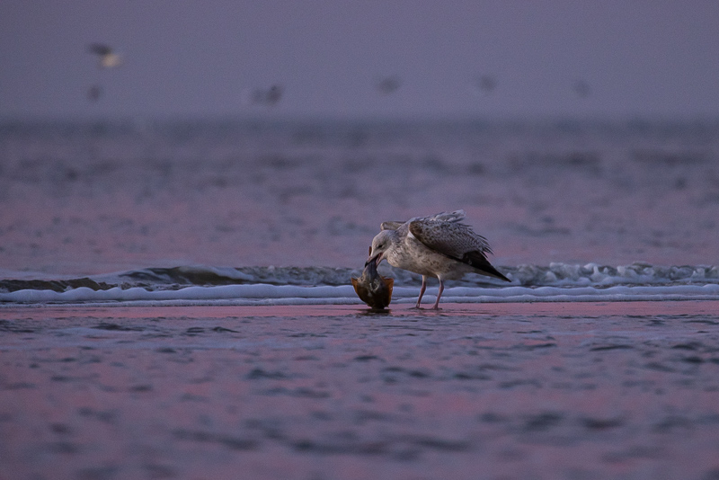 Na zonsondergang op het strand van Camperduin ving een jonge Zilvermeeuw een kleine platvis, waarschijnlijk een Schar. Met hoge Iso’s nog wat beelden kunnen maken. Er moest natuurlijk nog wel even om geknokt worden met een oudere vogel. De roze en paarse gloed maakte de lucht en omgeving bijzonder.