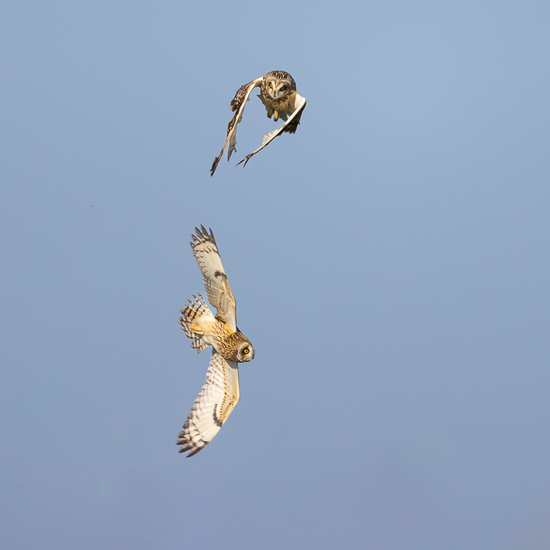 De late herfstmaanden zijn een hele goede velduilenspottijd. De Friese kust bij het Lauwersmeer en Moddergat is hiervoor dan een bekende plek. Ons enige bij daglicht vliegende en foeragerende uil (33-40cm) is een ware luchtacrobaat en een schoonheid om te zien. In strijd met een rivaal in de lucht een drietal foto’s van het afgelopen weekend.