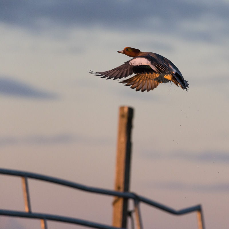 Veel eenden kunnen bij schrik loodrecht omhoog de lucht in gaan. In de polder bij Wormer en Jips dichtbij de polderwegen gebeurt dat nog wel eens. Een woerd in zijn prachtige kleed recht omhoog bij een boerenhek.
