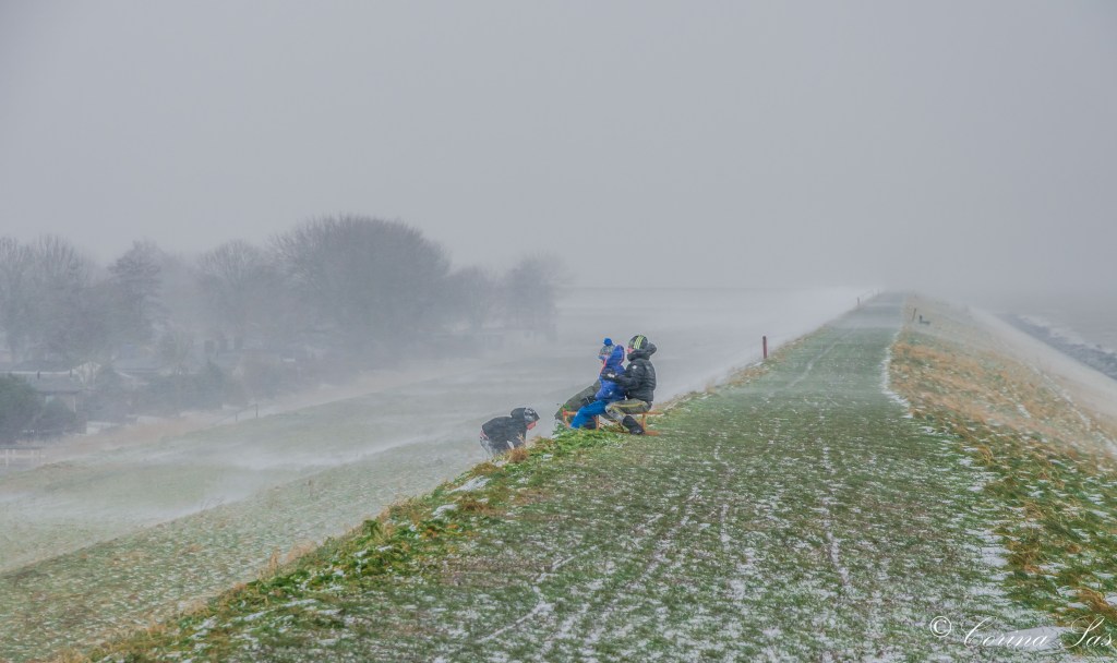 Vorig jaar op 7 februari startte de winter met flinke sneeuwval en een stevige oostenwind. Die wind maakte op vele plekken in het dorp flinke sneeuwduinen. Op sommige wegen was er geen doorkomen meer aan. Ben die dag tijdens de sneeuwbui op pad gegaan en heb een wandeling gemaakt boven op de Westfriese Omringdijk in Andijk. Gestart bij de Hoekweg, met de wind in de rug, richting de haven. Vanaf de dijk kijk je de proefpolder in waar nu vele vakantiehuisjes staan. De Proefpolder was de eerste polder die in 1926-1927 werd aangelegd in de Zuiderzee.