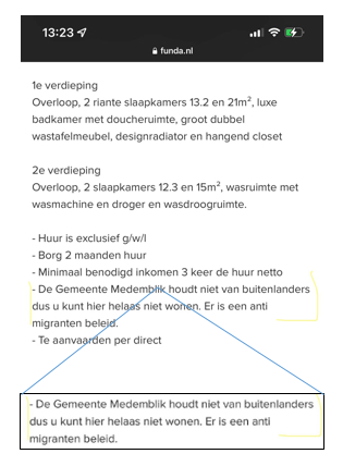 De gemeente Medemblik gaat juridische stappen ondernemen aan de bron van een advertentietekst waarin wordt beweerd dat de gemeente “niet van buitenlanders houdt” en een “anti-migrantenbeleid” erop na zou houden. De advertentie gaat om het verhuren van een woning in de stad Medemblik. De gemeente vindt deze tekst discriminerend en kwetsend en laat het er niet bij zitten en neemt juridische stappen.