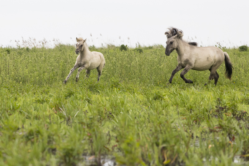 Overal jong leven en net zo in de Oostvaardersplassen. Een veulen rennend speels over het veld bij 1 van de poelen (dit jaar gelukkig niet opgedroogd) met de merrie. Een prachtig gezicht langs de Zeearend route achter het bezoekerscentrum aan de Knardijk. Foto: f/5,6, 1/3200 sec. Iso 1600